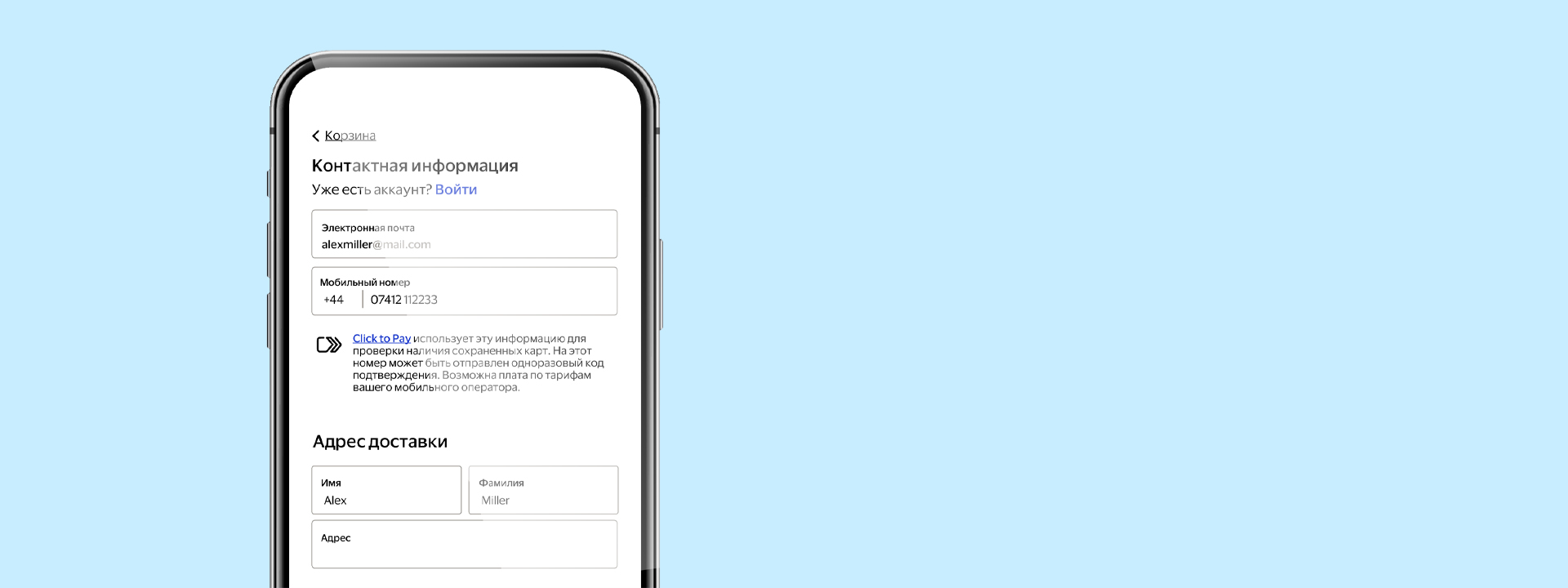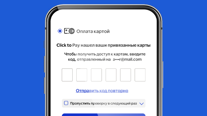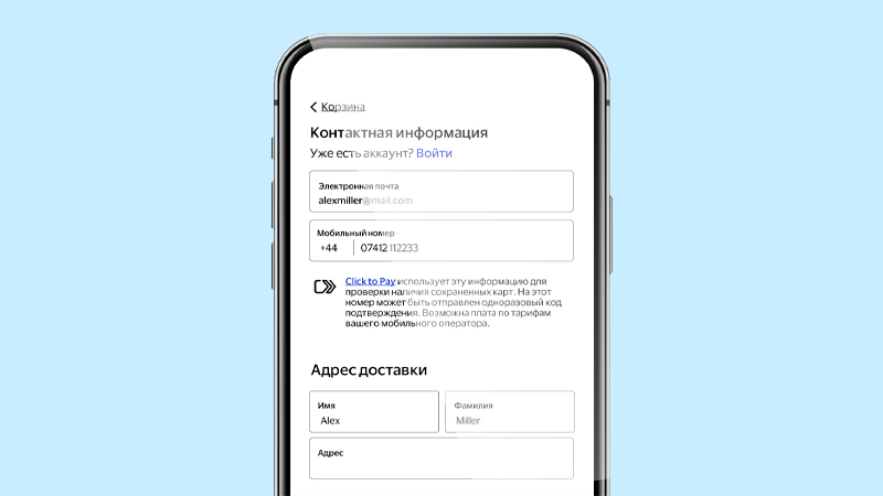 Укажите адрес своей электронной почты или номер мобильного телефона при оформлении заказа, чтобы найти привязанную карту Click to Pay.